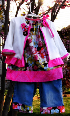 For instance, Endeavor's shirt had a stain on it, towards the hemline. So, I cut off the shirt above the hem, cut up to the neckline, and trimmed the edges with fabric so it became a cropped cardigan.